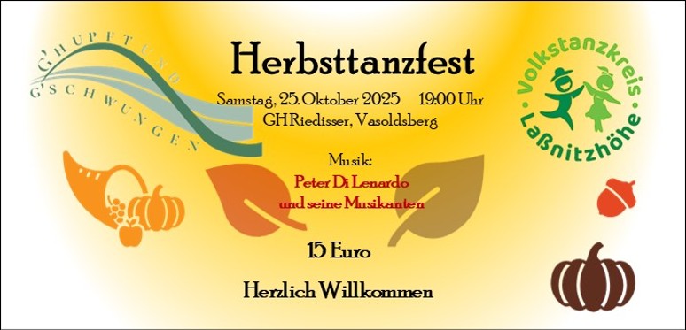 Datum 25.10.2025 Uhrzeit 19:00 - 19:00 Preis € 15,00 Veranstaltungsarten Tanzfeste Herbstvolkstanzfest VTK Lassnitzhöhe Herzliche Einladung! Wir freuen uns auf Euer Kommen! Musik Peter Di Lenardo und seine Musikanten + Zu Google Kalender hinzufügen + iCal / Outlook exportieren